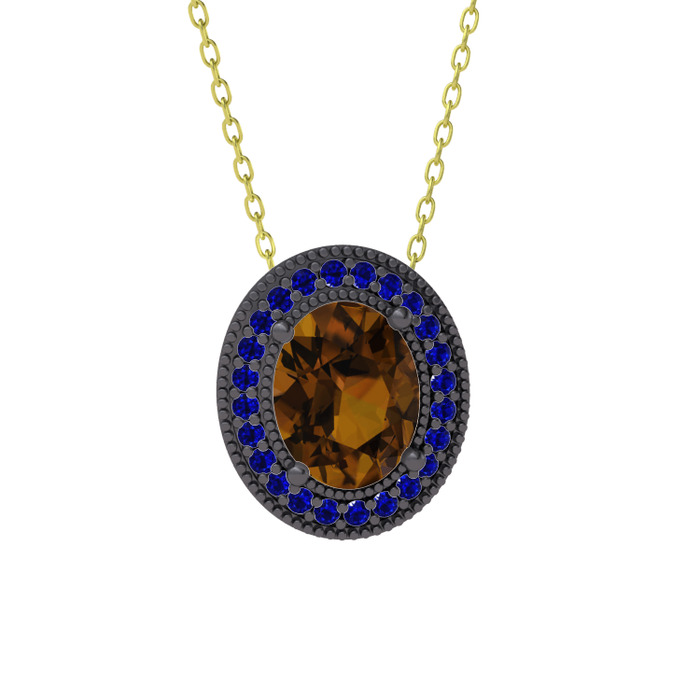 Dumanlı kuvars ve lab safir 925 ayar siyah rodyum kaplama gümüş kolye (40 cm altın rolo zincir)