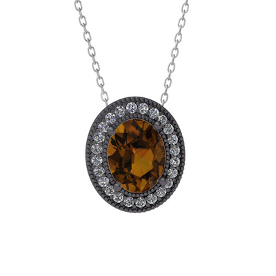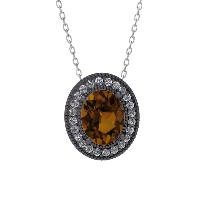 Dumanlı kuvars ve pırlanta 925 ayar siyah rodyum kaplama gümüş kolye (0.264 karat, 40 cm beyaz altın rolo zincir)