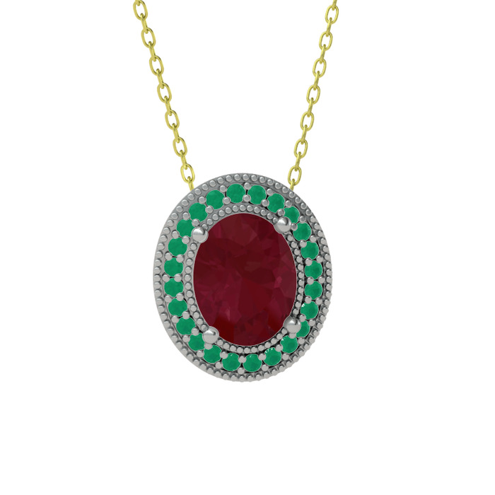 Kök yakut ve kök zümrüt 18 ayar beyaz altın kolye (40 cm gümüş rolo zincir)