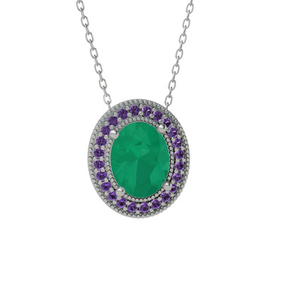 Kök zümrüt ve ametist 18 ayar beyaz altın kolye (40 cm gümüş rolo zincir)