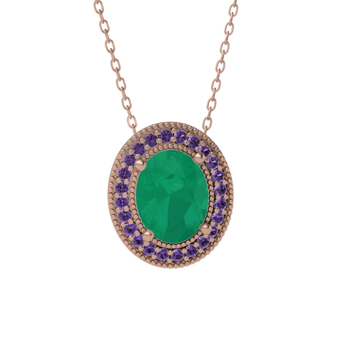 Kök zümrüt ve ametist 925 ayar rose altın kaplama gümüş kolye (40 cm rose altın rolo zincir)