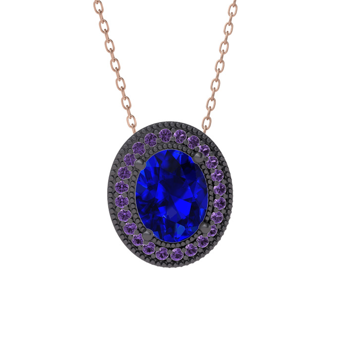 Lab safir ve ametist 925 ayar siyah rodyum kaplama gümüş kolye (40 cm gümüş rolo zincir)
