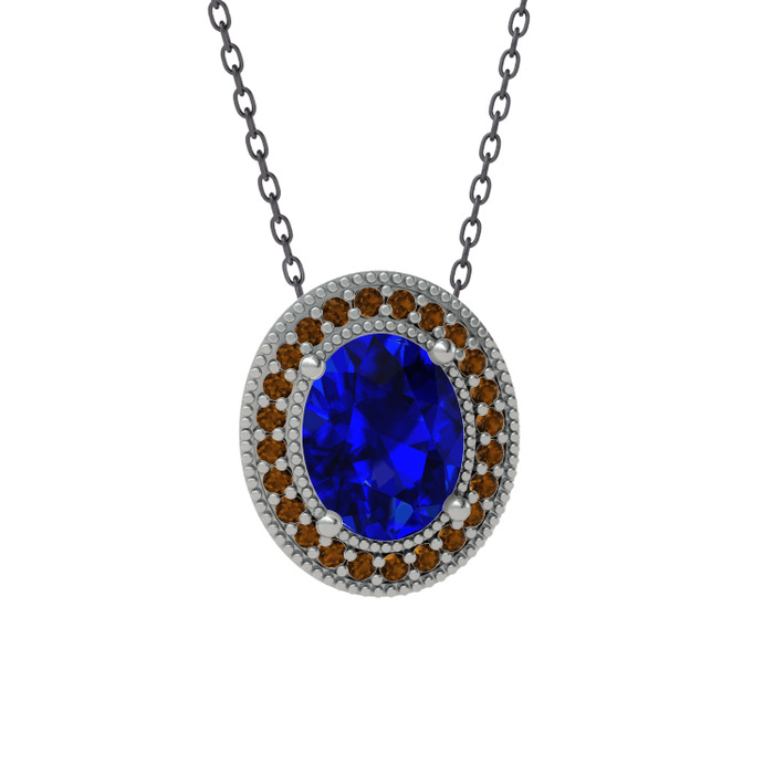 Lab safir ve dumanlı kuvars 14 ayar beyaz altın kolye (40 cm gümüş rolo zincir)