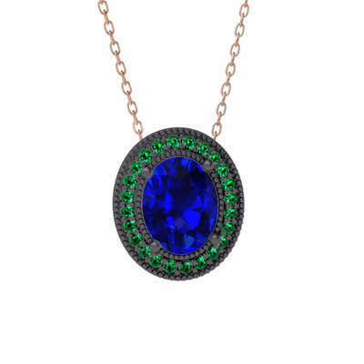 Lab safir ve yeşil kuvars 925 ayar siyah rodyum kaplama gümüş kolye (40 cm rose altın rolo zincir)