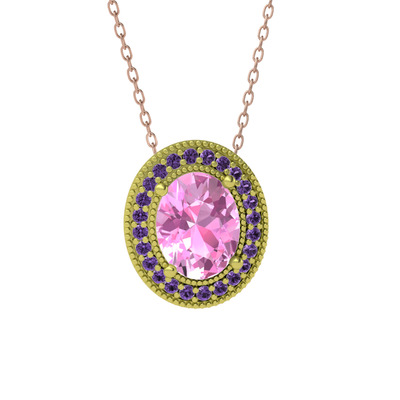 Pembe kuvars ve ametist 8 ayar altın kolye (40 cm rose altın rolo zincir)