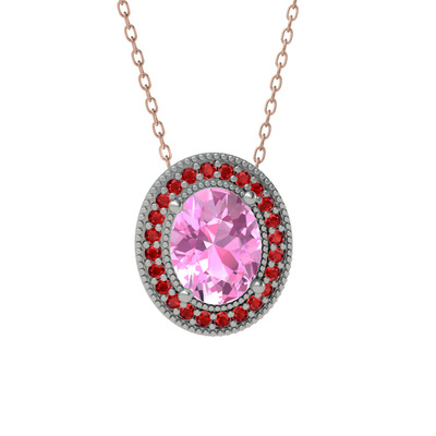 Pembe kuvars ve garnet 18 ayar beyaz altın kolye (40 cm gümüş rolo zincir)
