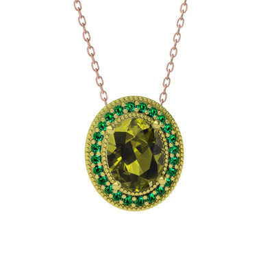 Peridot ve yeşil kuvars 18 ayar altın kolye (40 cm rose altın rolo zincir)