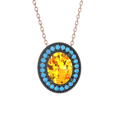 Sitrin ve akuamarin 925 ayar siyah rodyum kaplama gümüş kolye (40 cm rose altın rolo zincir)