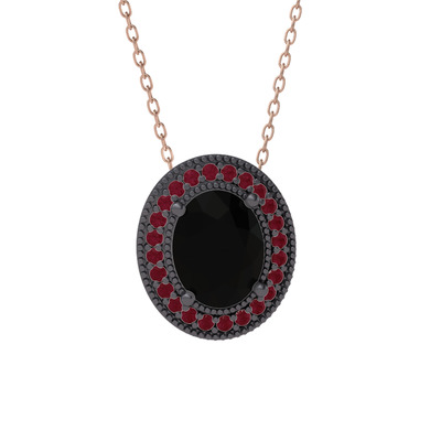 Siyah zirkon ve kök yakut 925 ayar siyah rodyum kaplama gümüş kolye (40 cm rose altın rolo zincir)