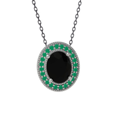 Siyah zirkon ve kök zümrüt 18 ayar beyaz altın kolye (40 cm gümüş rolo zincir)