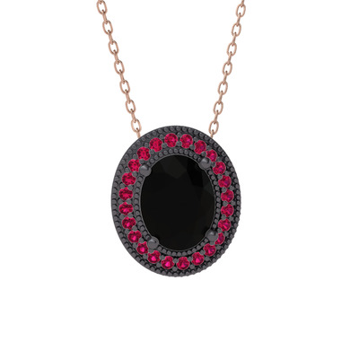 Siyah zirkon ve rodolit garnet 925 ayar siyah rodyum kaplama gümüş kolye (40 cm gümüş rolo zincir)