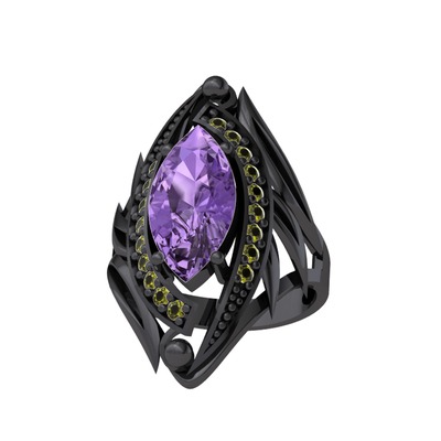 Ametist ve peridot 925 ayar siyah rodyum kaplama gümüş yüzük