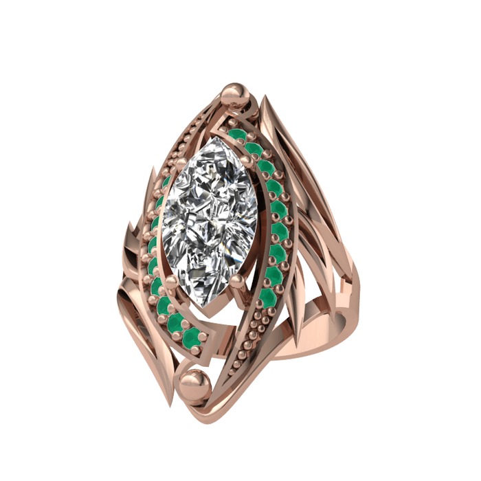 Beyaz zirkon ve kök zümrüt 925 ayar rose altın kaplama gümüş yüzük