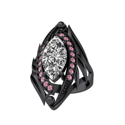 Beyaz zirkon ve pembe kuvars 925 ayar siyah rodyum kaplama gümüş yüzük
