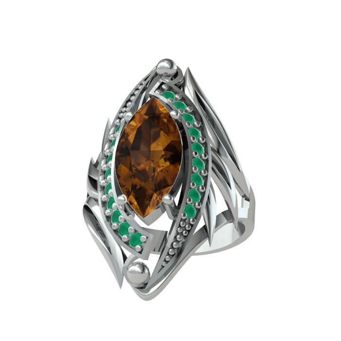 Dumanlı kuvars ve kök zümrüt 18 ayar beyaz altın yüzük