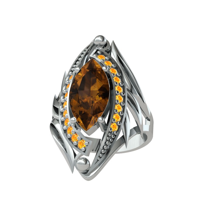 Dumanlı kuvars ve sitrin 8 ayar beyaz altın yüzük