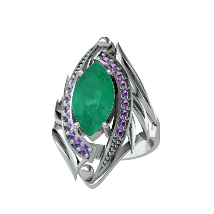 Kök zümrüt ve ametist 18 ayar beyaz altın yüzük
