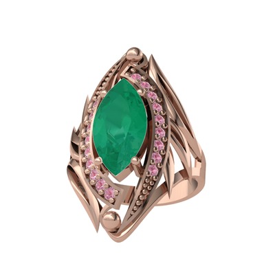 Kök zümrüt ve pembe kuvars 14 ayar rose altın yüzük