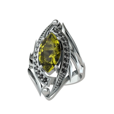 Peridot ve siyah zirkon 14 ayar beyaz altın yüzük