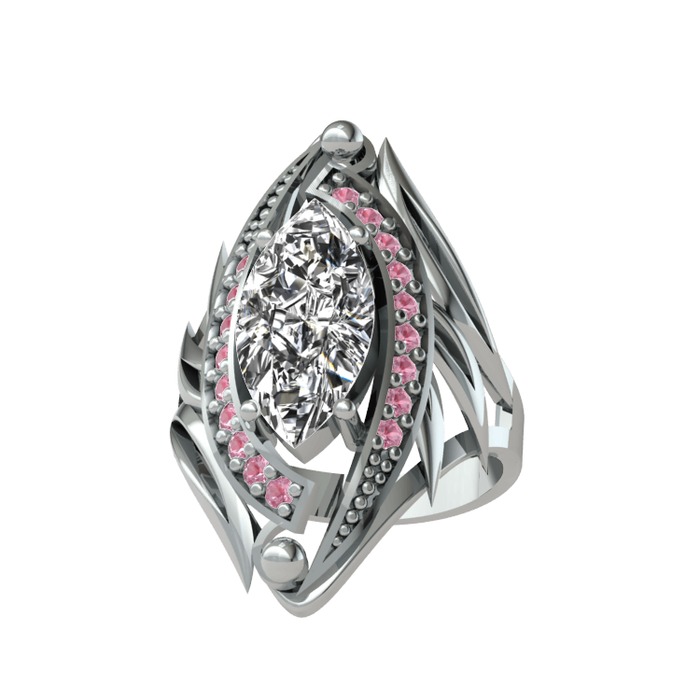 Swarovski ve pembe kuvars 14 ayar beyaz altın yüzük