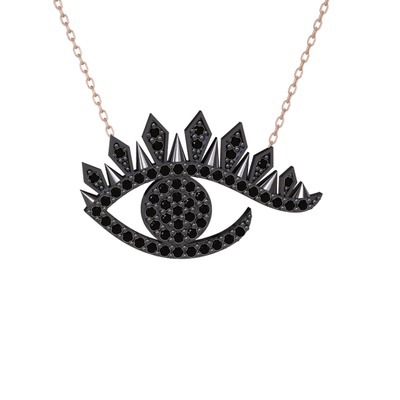 Siyah zirkon 925 ayar siyah rodyum kaplama gümüş kolye (40 cm rose altın rolo zincir)