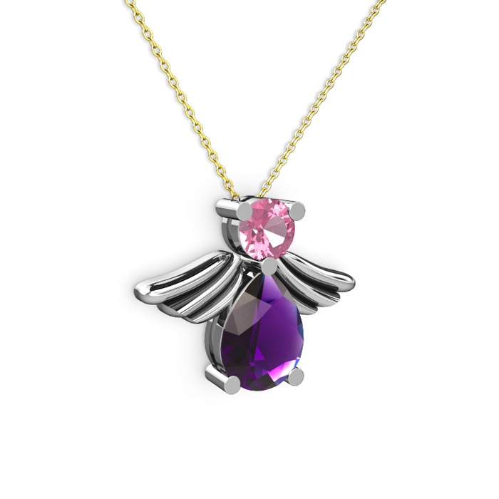 Ametist ve pembe kuvars 8 ayar beyaz altın kolye (40 cm altın rolo zincir)