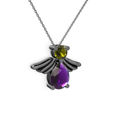Ametist ve peridot 925 ayar siyah rodyum kaplama gümüş kolye (40 cm gümüş rolo zincir)