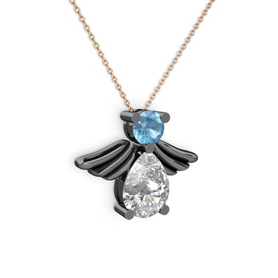 Beyaz zirkon ve akuamarin 925 ayar siyah rodyum kaplama gümüş kolye (40 cm rose altın rolo zincir)