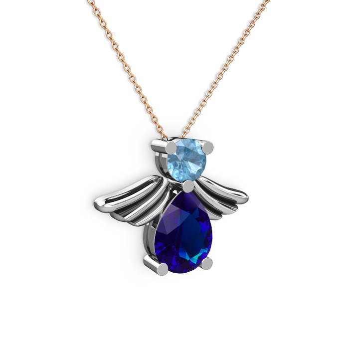 Lab safir ve akuamarin 14 ayar beyaz altın kolye (40 cm rose altın rolo zincir)