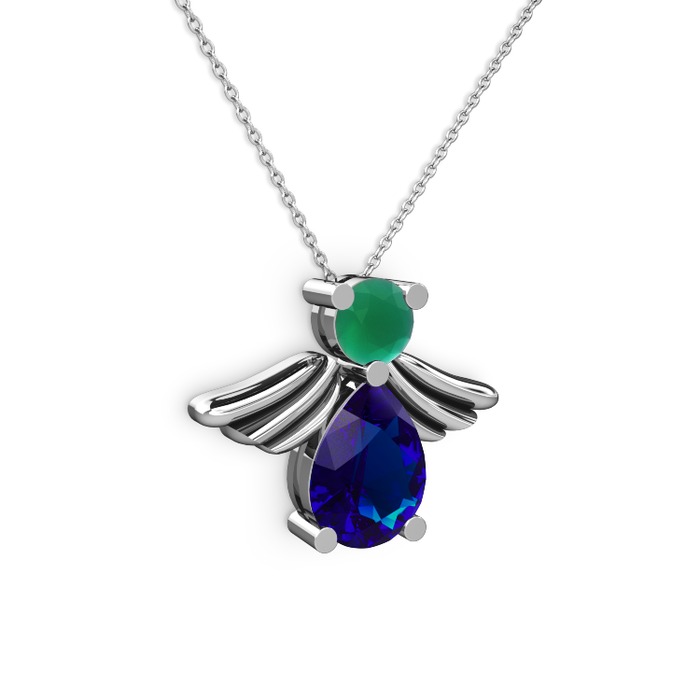 Lab safir ve kök zümrüt 18 ayar beyaz altın kolye (40 cm gümüş rolo zincir)