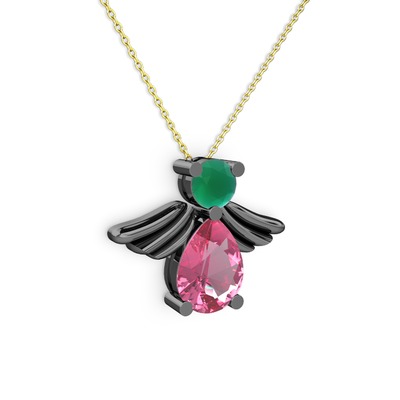 Pembe kuvars ve kök zümrüt 925 ayar siyah rodyum kaplama gümüş kolye (40 cm altın rolo zincir)