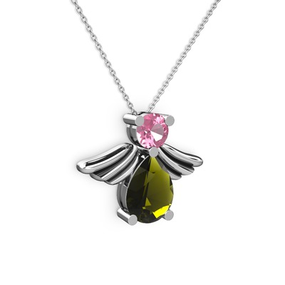 Peridot ve pembe kuvars 18 ayar beyaz altın kolye (40 cm gümüş rolo zincir)