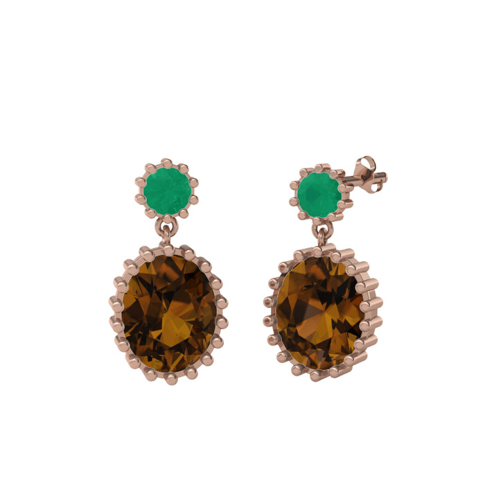 Kök zümrüt ve dumanlı kuvars 18 ayar rose altın küpe