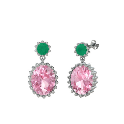 Kök zümrüt ve pembe kuvars 14 ayar beyaz altın küpe