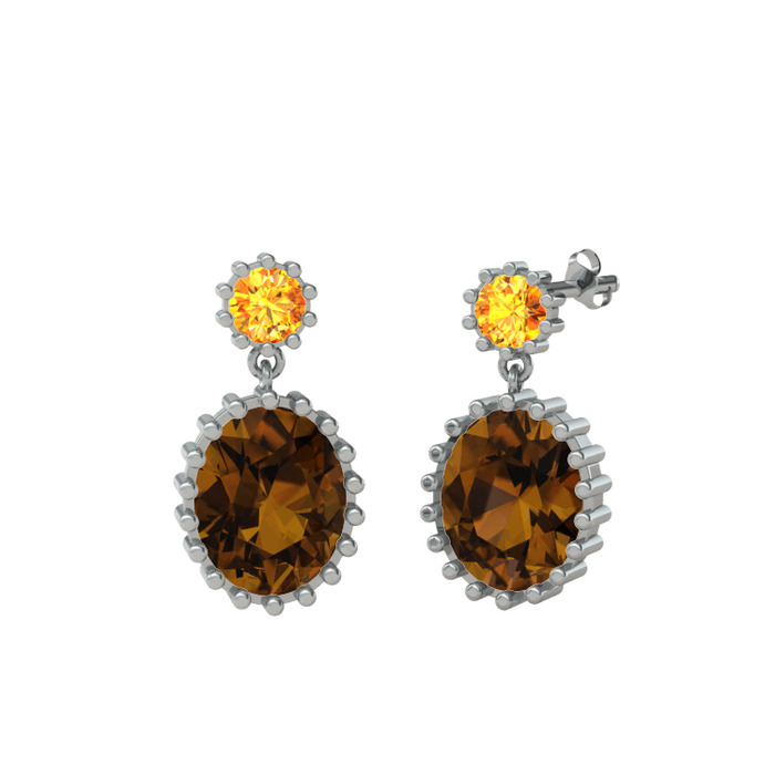 Sitrin ve dumanlı kuvars 8 ayar beyaz altın küpe