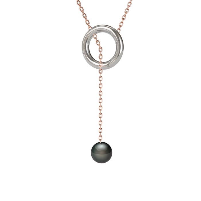 Siyah inci 18 ayar beyaz altın kolye (110 cm rose altın rolo zincir)