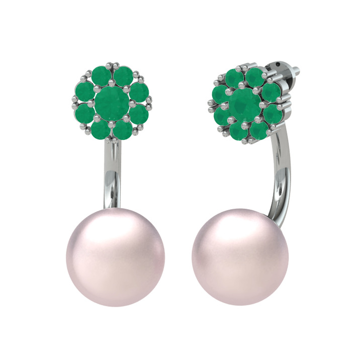 Kök zümrüt ve pembe inci 8 ayar beyaz altın küpe