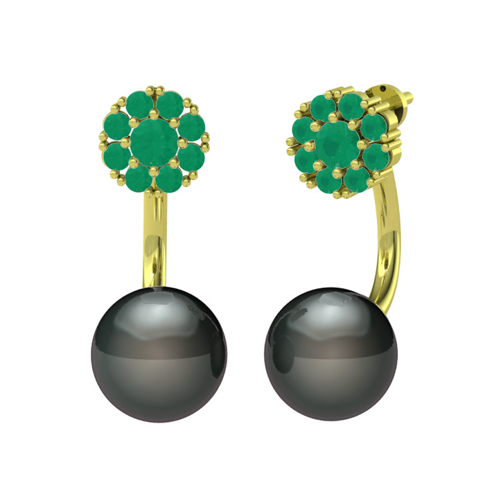 Kök zümrüt ve siyah inci 14 ayar altın küpe
