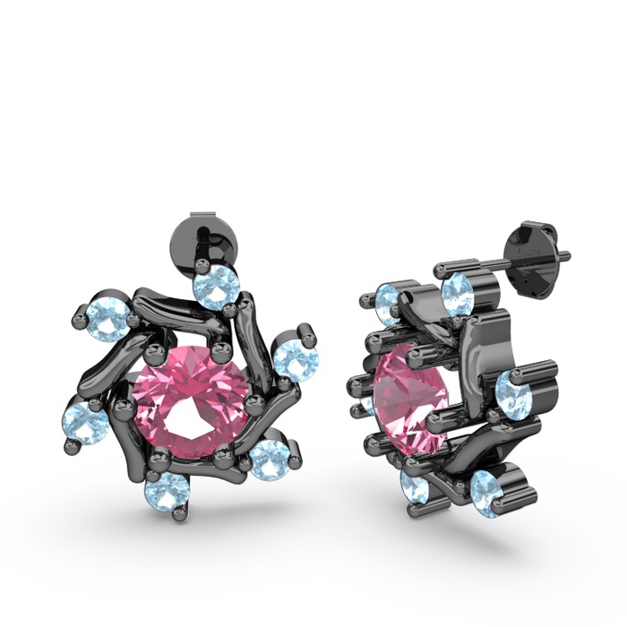 Akuamarin ve pembe kuvars 925 ayar siyah rodyum kaplama gümüş küpe