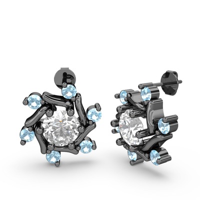Akuamarin ve pırlanta 925 ayar siyah rodyum kaplama gümüş küpe (1 karat)