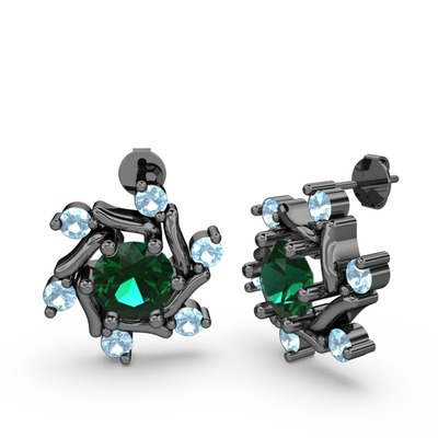 Akuamarin ve yeşil kuvars 925 ayar siyah rodyum kaplama gümüş küpe