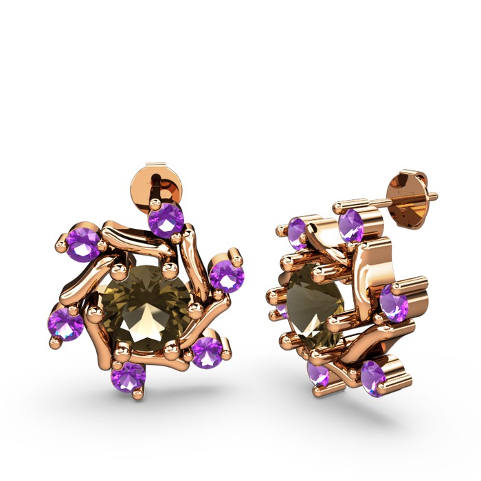 Ametist ve dumanlı kuvars 14 ayar rose altın küpe