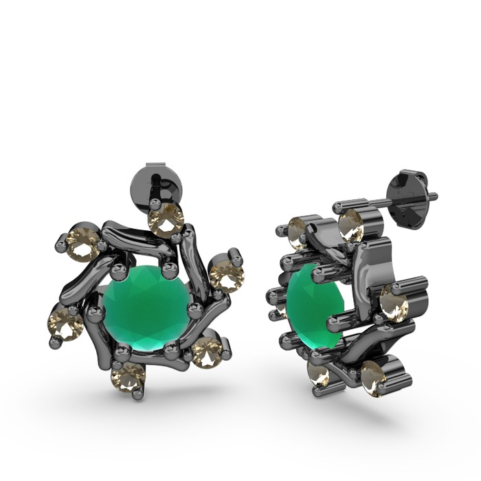 Dumanlı kuvars ve kök zümrüt 925 ayar siyah rodyum kaplama gümüş küpe
