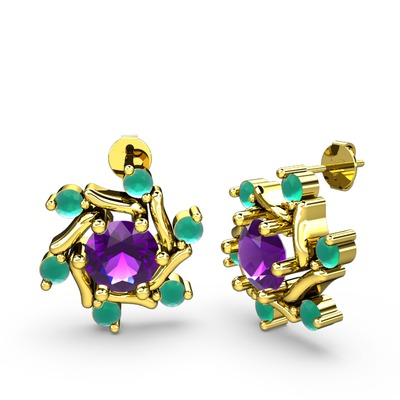 Kök zümrüt ve ametist 8 ayar altın küpe