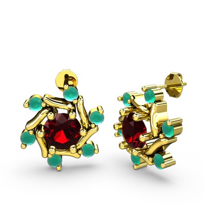 Kök zümrüt ve garnet 14 ayar altın küpe