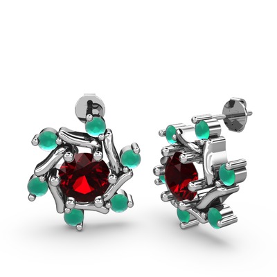 Kök zümrüt ve garnet 14 ayar beyaz altın küpe