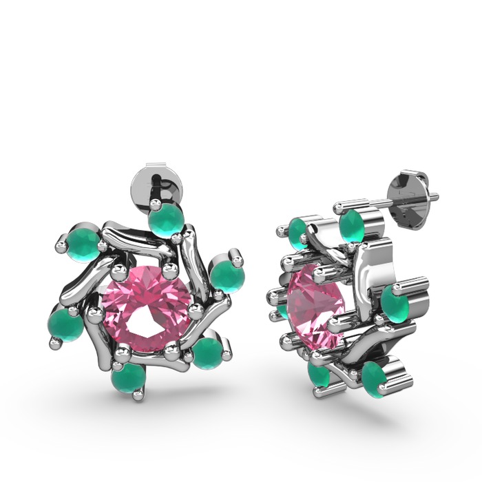 Kök zümrüt ve pembe kuvars 18 ayar beyaz altın küpe