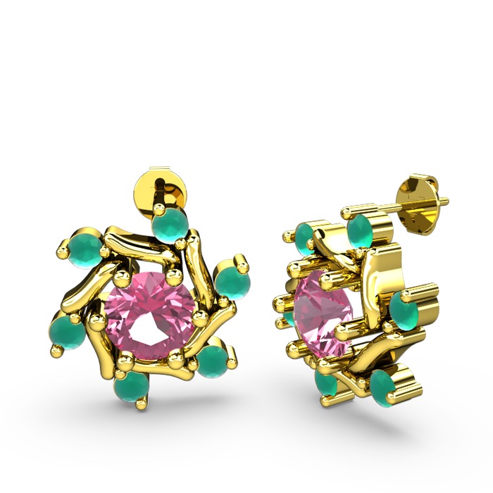 Kök zümrüt ve pembe kuvars 8 ayar altın küpe