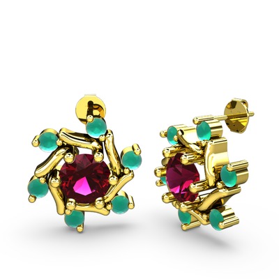 Kök zümrüt ve rodolit garnet 18 ayar altın küpe