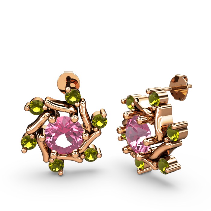 Peridot ve pembe kuvars 14 ayar rose altın küpe